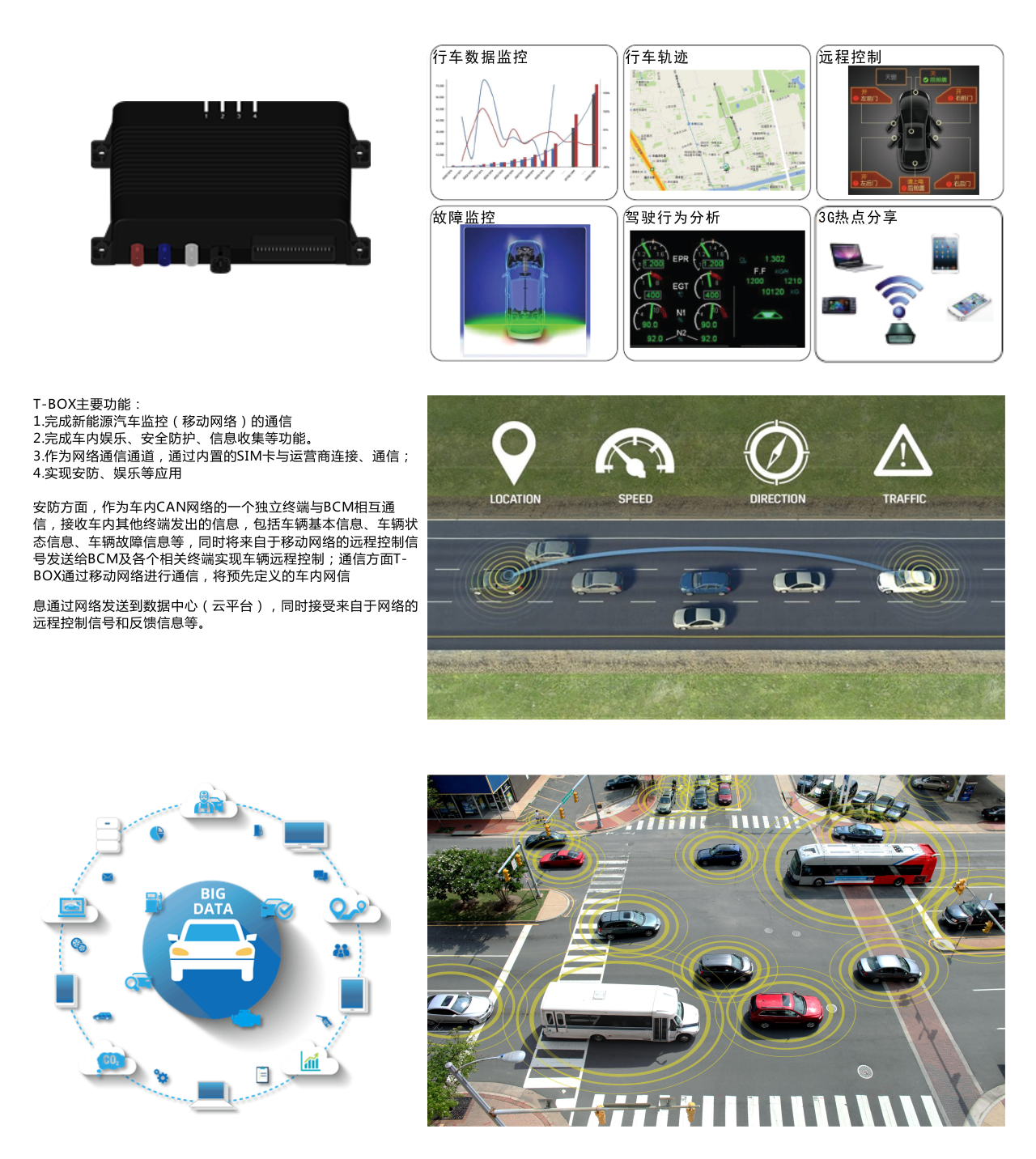 智能車載終端系統(tǒng) Intelligent vehicle terminal systemT-Box 作為無線網(wǎng)關(guān)為整車提供遠(yuǎn)程通訊接口,可深度讀取汽車Can總線數(shù)據(jù)和私有協(xié)議,T-Box終端具有雙核處理的OBD模塊,雙核處理的CPU構(gòu)架,分別采集汽車總線Dcan、Kcan、PTcan相關(guān)的總線數(shù)據(jù)和私有協(xié)議反向控制,通過移動網(wǎng)絡(luò)將數(shù)據(jù)傳出到云服務(wù)器,可以提供行車數(shù)據(jù)采集、行駛軌跡記錄、車輛故障監(jiān)控、車輛遠(yuǎn)程控制(開閉鎖、空調(diào)控制、車窗控制、發(fā)送機(jī)扭矩限制、發(fā)動機(jī)啟停)、駕駛行為分析、4G 無線熱點(diǎn)分享等服務(wù)。